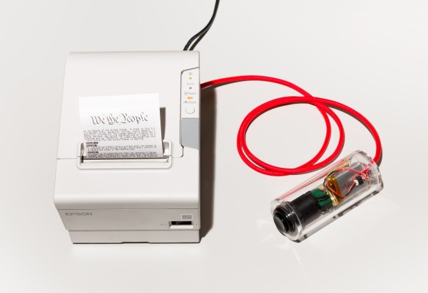 Consti2Go is a guerilla device hijacking existing printing infrastructures. It connects to standard ticket printers found in any commercial facility and allows, on the press of a button, to print a full copy of the US Constitution, creating a shadow content distribution network.