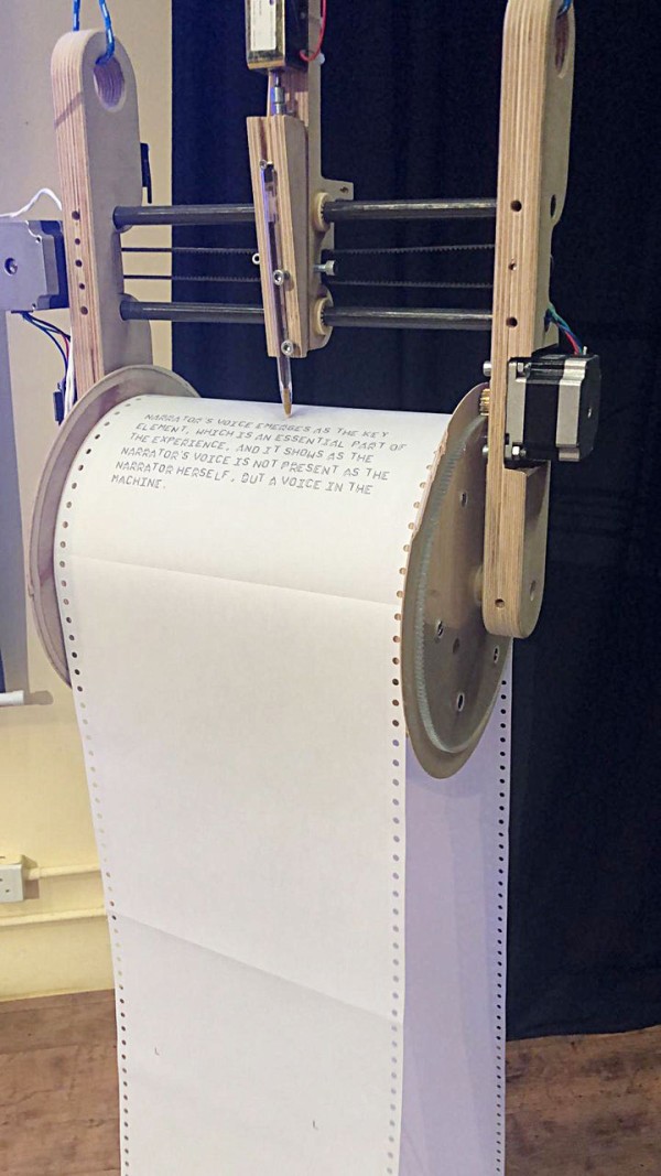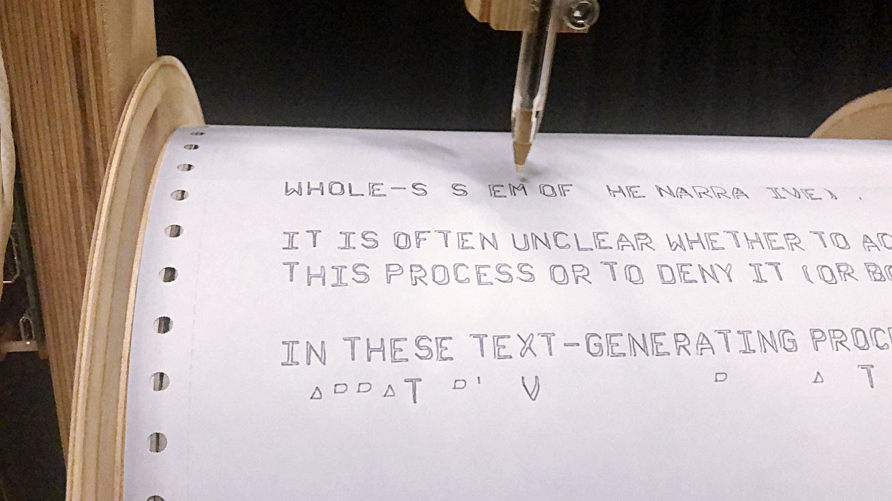 Ghost Writer embodies these topics by embedding an Artificial Intelligence system programmed to generate a continuous stream of text, a sort of algorithmic hallucinatory process from which the computer is able not to recognise input text, but generate novel, often strange and remarkable content. The digital mind is complemented by a physical body, a pen plotter, that it can control to write its story in a sort of autonomous typewriter. The lengthy printed stack of paper, attest of the obstination and thoughtlessness of the machine, but each paragraph, carefully computed manages to fulfil our need to recognise patterns and stories buried in the characters.