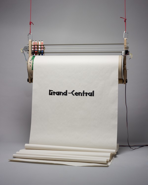 “ I am fascinated with the relationship that is created between virtual networks and the world. I developed a platform that works basically as a guestbook. People can access a webpage where they can openly submit text or images. The flow of messages is written in real time on a large custom-made plotter working like a cash-register. In recent years I have become very interested in the creative use of technology enabled by rapid prototyping techniques. I think it is important to keep control of our work environment, therefore I always try to develop my own tools adapted for each different project. “ Grand-Central ” for me is the culmination of my research as I was able to mix all the different aspects I love to play with ” Thibault Brevet