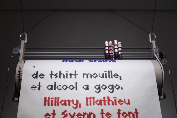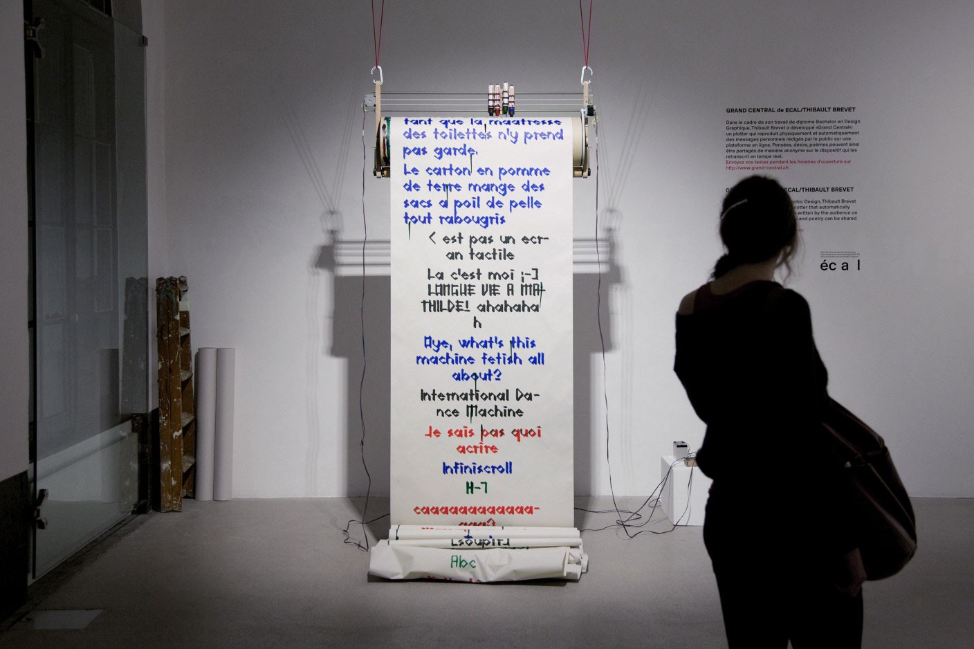 For his degree in Graphic design, Thibault Brevet conceived "Grand Central": a plotter that automatically reproduces personal messages written by the audience on a live platform. Thoughts, wishes and poetry can be shared anonymously and live. Send your texts during open hours: http://www.grand-central.ch/