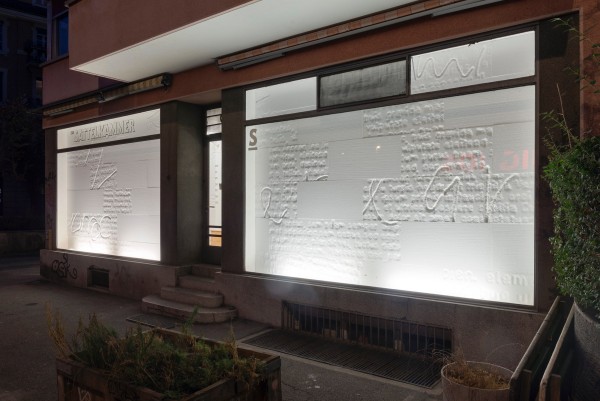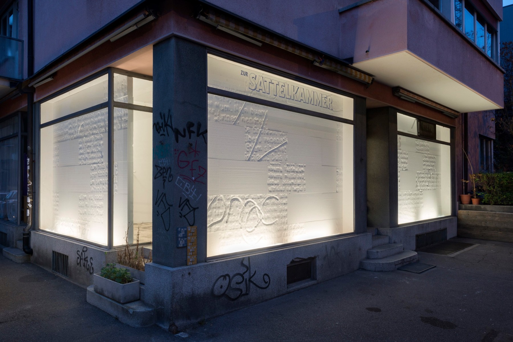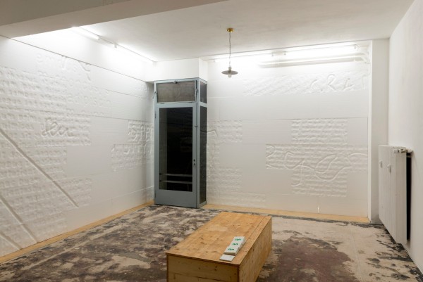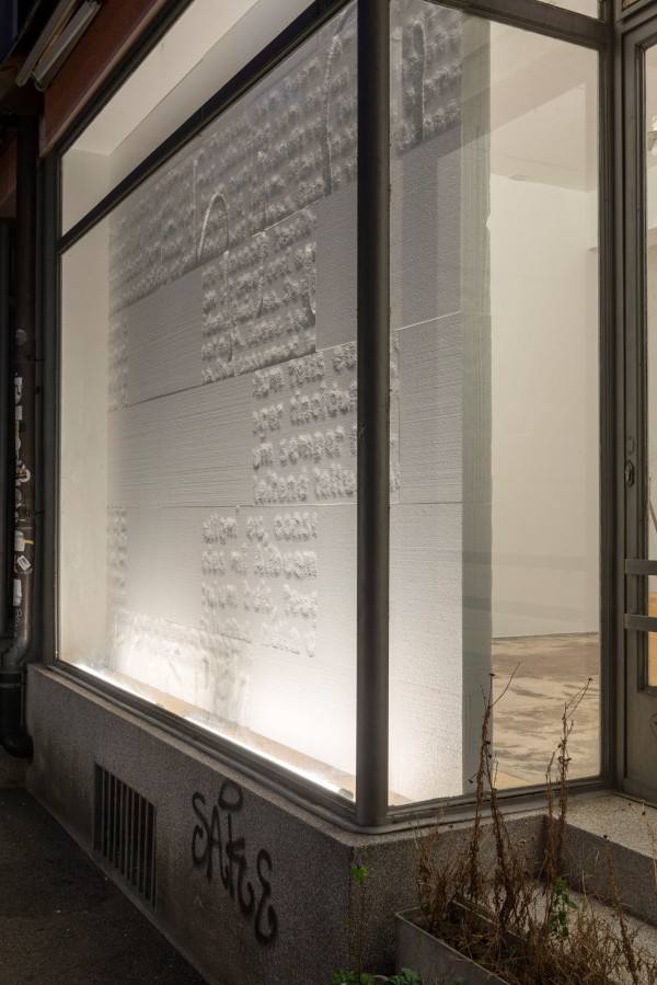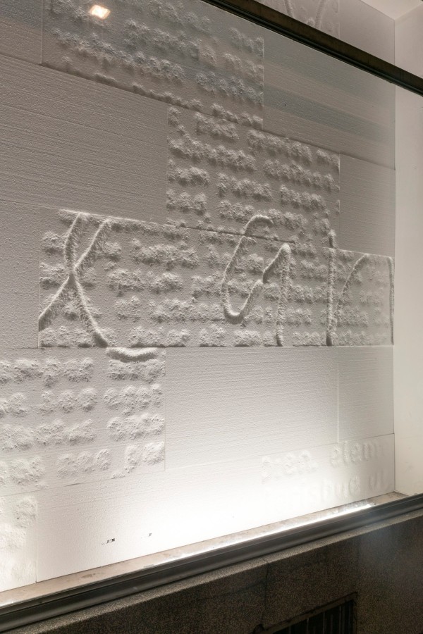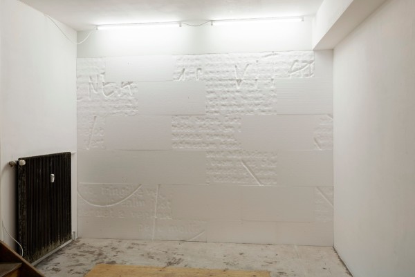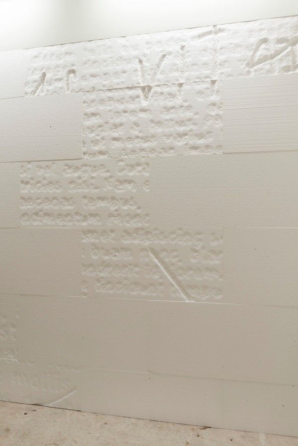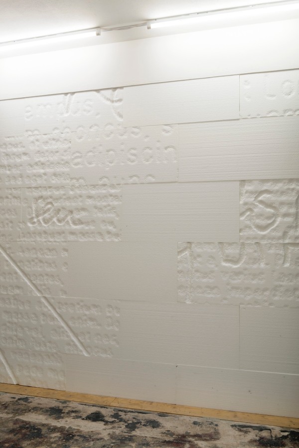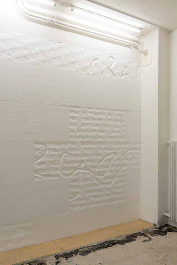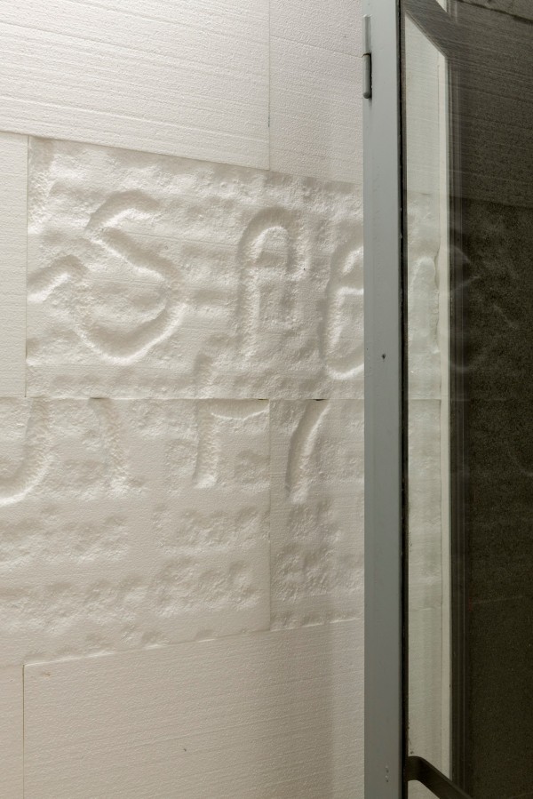 In computer graphics, a Texel is the smallest unit of a texture, a repetitive pattern applied on surfaces. TEXEL was an in-situ installation shown at Sattelkammer in Bern, CH. The project is the result of a research on writing systems and information storage. How is information flowing from the digital realm to an engraved surface, almost readable. Glimpses of sentences can be inferred sometimes, sometimes not. Layers of meaning and timescales overlap, in this massive mural, fruit of an ad-hoc robotic foam engraving system developed by AATB in collaboration with Lucas Uhlmann.