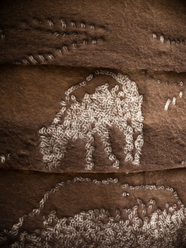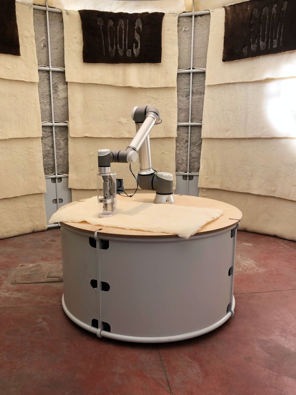 The robotic felt-production is the consequence of a customised technique of hard and software functionalities. The motorised felting tool at the end of the robot allows to modify the number of needles as well as the pattern in which they are arranged. As a result, the stroke size of the felted pattern might range from one point to several centimeters. The software can handle various data inputs such as SVG, PNG, and JSON. This enables a modular digital manufacturing process, which may still be modified by adjusting the hardware parameters. Wool Tools seeks a balance between digitally controlled tools and conventional felting techniques.