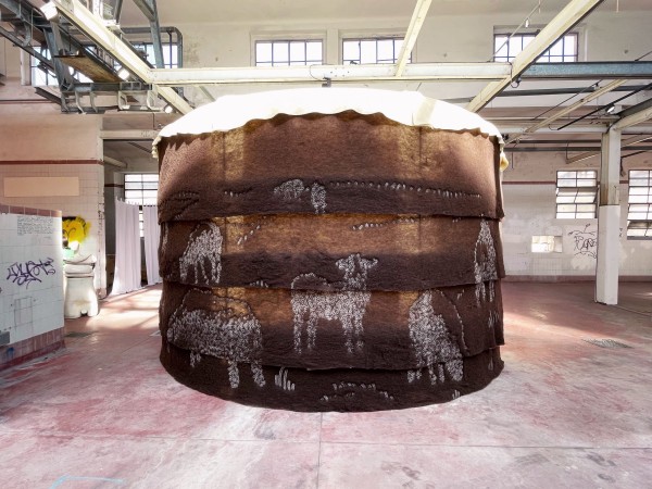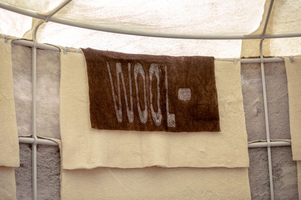 The Felted Wool Pavilion is part of the Bioregional Design Practices exhibition by Atelier LUMA, presented at Alcova during Milan Design Week 2023 – in collaboration with AATB. The pavilion is showcasing an intermediate result of the research project „Wool Tools“, investigating novel felt production. The outside of the pavilion shows a large-scale illustration of a sheep herd in the Camargue Area. The robotic felting technique is used to assemble all the wall layers in a functional felt seam. Inside the pavilion, a robotic arm demonstrates the customised felting process in a live production that combines traditional needle felting, new physical tool and digital methods with its various possibilities to felt typography, illustrations, patterns and gradients.