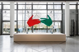 The physical installation consists of two robotic arms, each equipped with an over-sized hand. They are facing each other and moving together, following the directions of two people from afar. This virtual platform enables visitors to take control of the robots. The chance to control a large and complex robot with ease, no manual needed here! An interaction as simple as reaching out and shaking your own hand but with a friend across the globe.