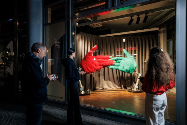 Handshake at ZKM Karlsruhe as part of the exhibition ”Media Art is here” at Triangel Space in Karlsruhe.