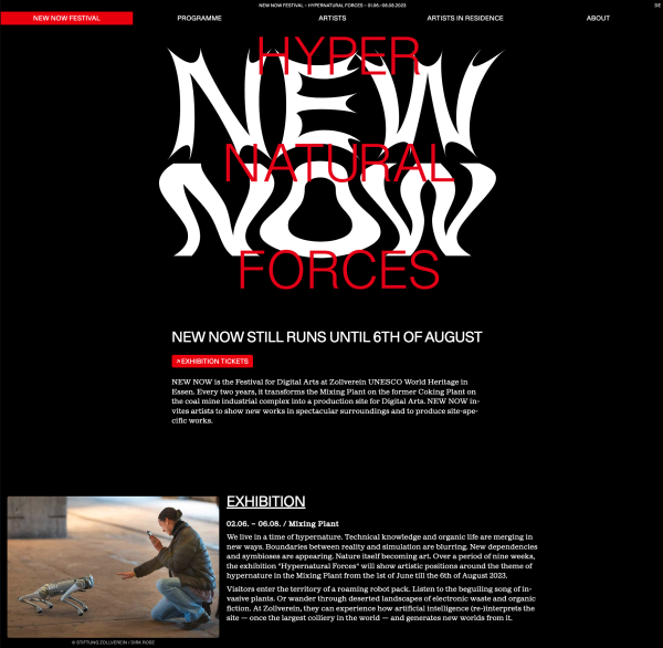 NEW NOW is a Festival for Digital Arts at Zollverein UNESCO World Heritage in Essen. It transforms the Mixing Plant on the former Coking Plant on the coal mine industrial complex into a production site for Digital Arts. NEW NOW invites artists to show new works in spectacular surroundings and to produce site-specific works.