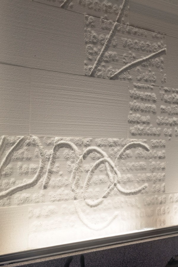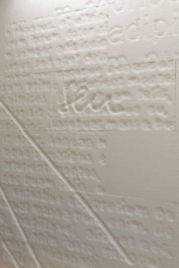 In computer graphics, a Texel is the smallest unit of a texture, a repetitive pattern applied on surfaces. TEXEL was an in-situ installation shown at Sattelkammer in Bern, CH. The project is the result of a research on writing systems and information storage. How is information flowing from the digital realm to an engraved surface, almost readable. Glimpses of sentences can be inferred sometimes, sometimes not. Layers of meaning and timescales overlap, in this massive mural, fruit of an ad-hoc robotic foam engraving system developed by AATB in collaboration with Lucas Uhlmann.
