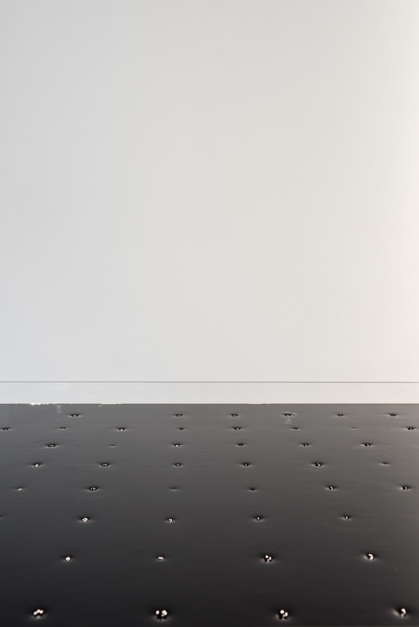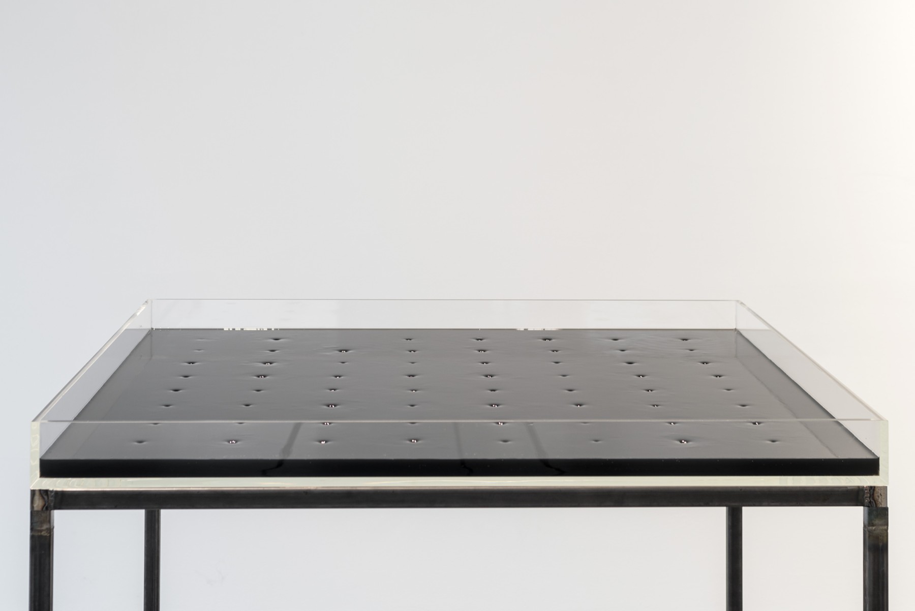 Untitled (64 Vortices) is a tank of water into which 64 vortices can be observed appearing and disappearing. The whole chaotic, unstable system constantly reconfigures itself as each vortex interacts with neighbouring vortices, alternatively stealing rotational energy or evaporating. Not dissimilar to a cosmic space-time warped by black holes, the work quietly keeps oscillating between stable and fleeting moments.