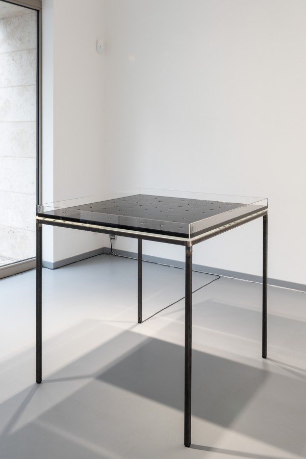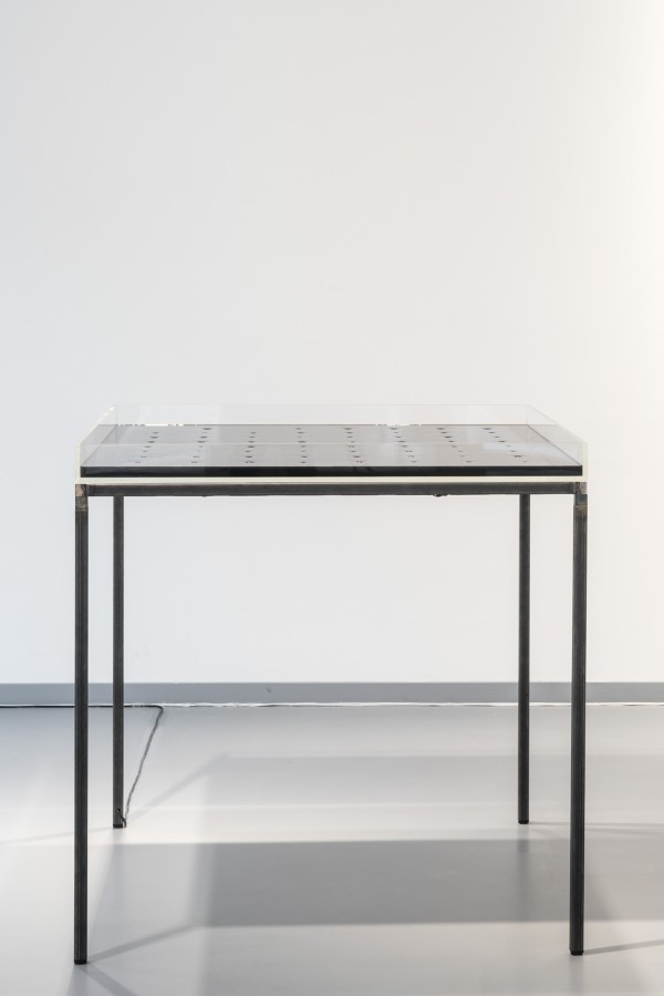 Acrylic glass, steel, black ink, magnetic stirrers, electronics, power supply